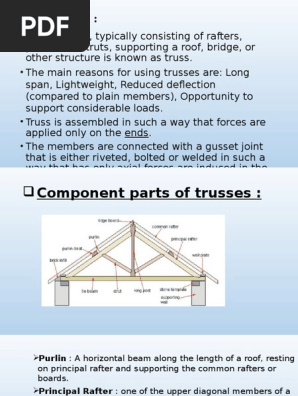 Types of roof trusses. The pitched or common truss and the parallel chord or flat truss. Advantages of pitched roof. There is no danger of the material being eaten away by white ants or other insects.